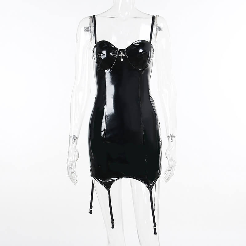 Unleash your inner confidence as you slip into our black shiny leather mini slip dress. Designed to accentuate your curves and make heads turn, this dress is the epitome of sensuality and empowerment. The smooth texture of the leather against your skin, combined with the subtle sheen, creates an irresistible appeal. Whether it's a night out on the town or a special occasion, this dress will effortlessly boost your self-assurance and ensure all eyes are on you.