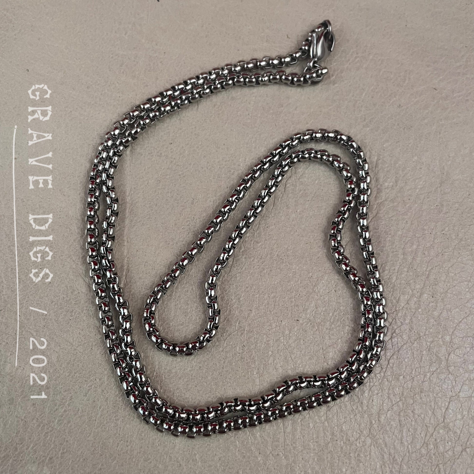 Offered with your choice of 24 inch long Silver or Black 3mm rounded box chain.