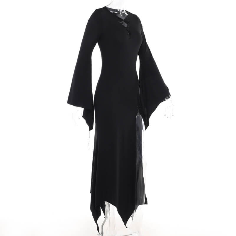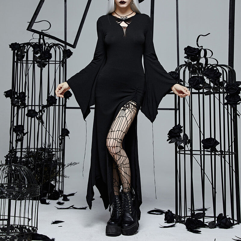 This gothic high slit bell sleeve polyester dress will make you stand out from the crowd. The chic bell sleeves hang elegantly on both sides, and the hollow design on the chest and high slit design add a touch of sophistication and sexiness to the classic Gothic style. This dress is made from lightweight polyester material, ensuring maximum comfort and flexibility. The high slit shows off your beautiful curves and makes a bold statement in this flattering dress.