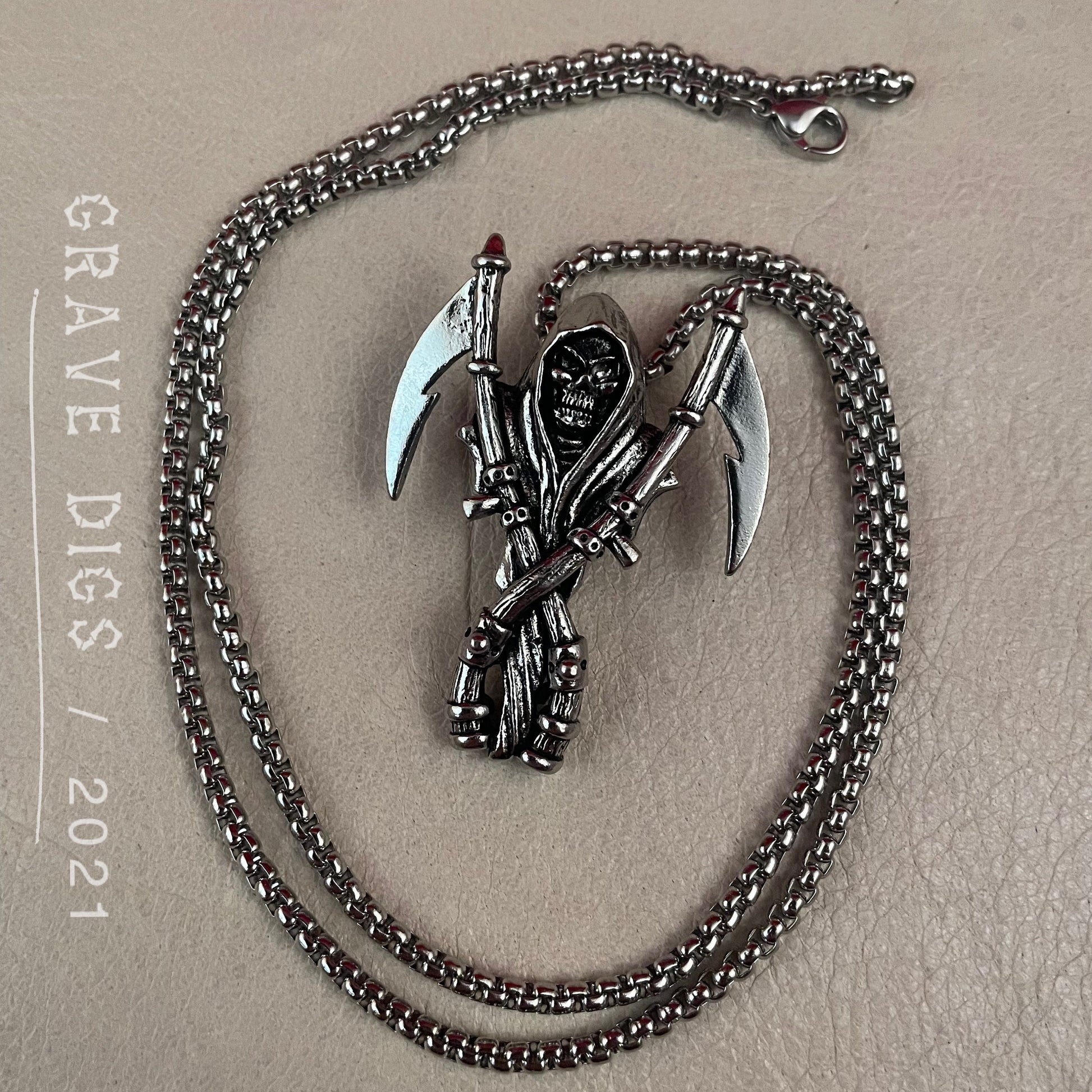 Grim Reaper Double Scythe Pendant Necklace | Silver or Black Chain | Gothic Fashion Jewelry