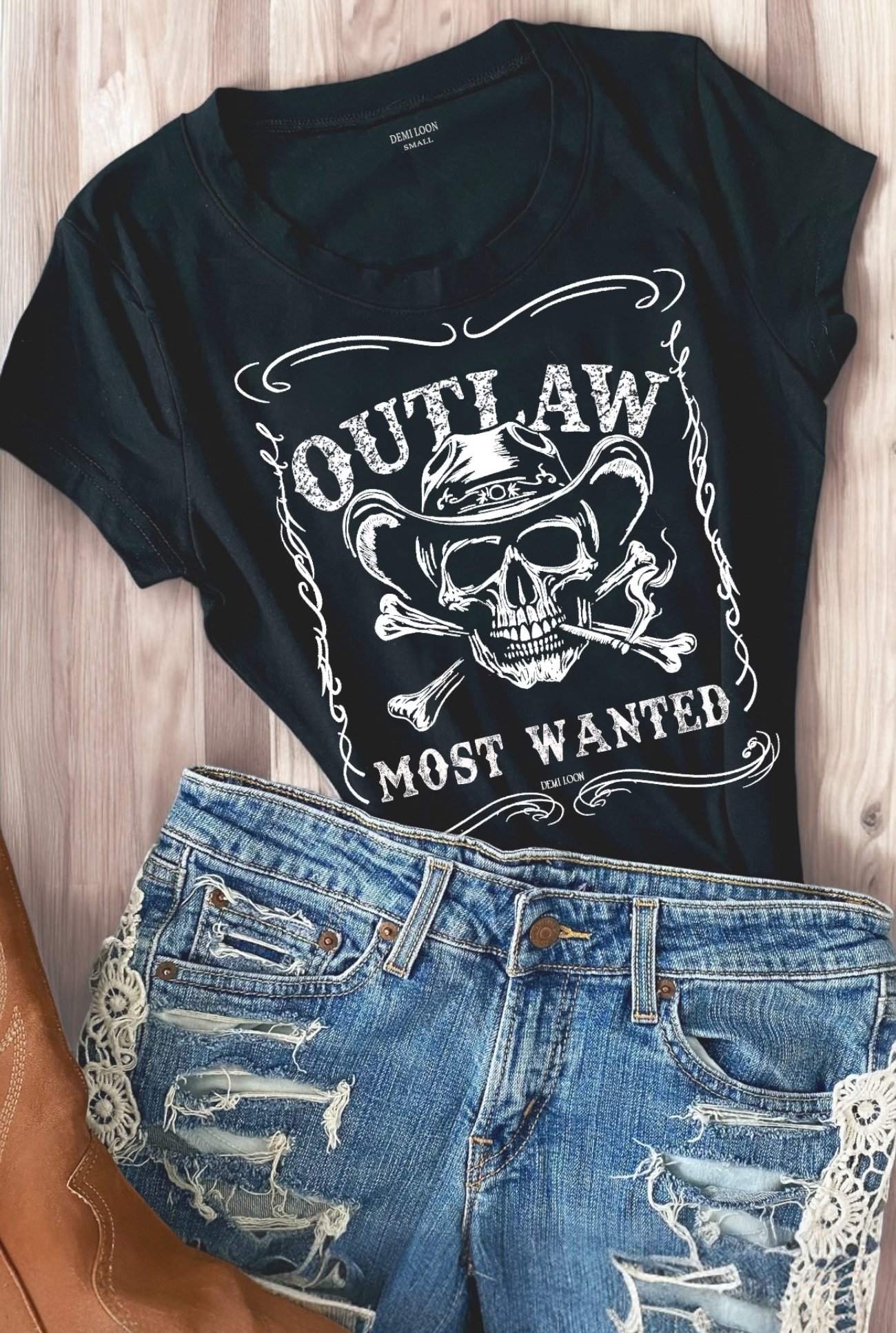 Outlaw Skull Cowboy Graphic Biker Cowgirl Country Tee