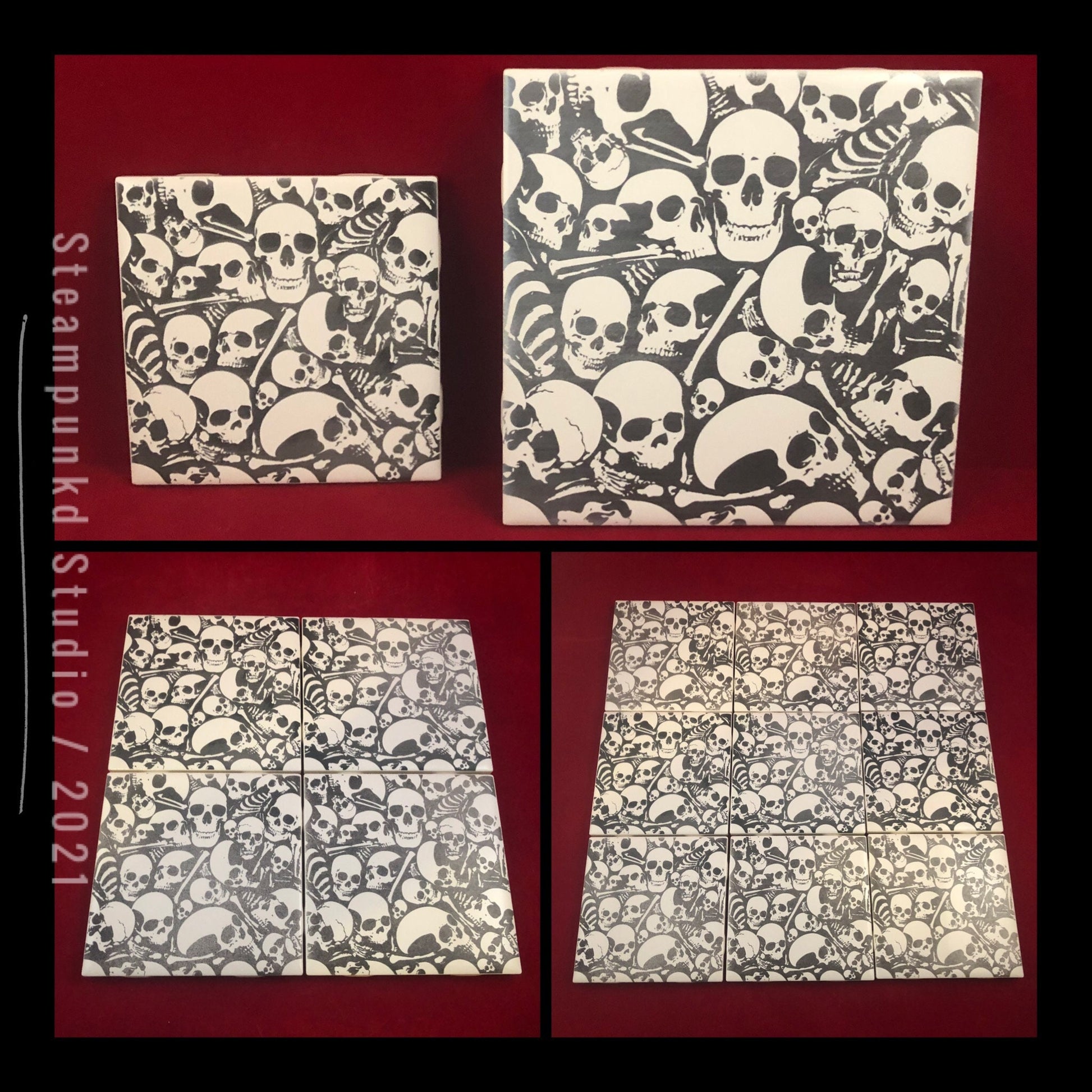 The seamlessly repeating skull and bones design is permanently etched into the tile. Making them ideal for both hot and cold items and drinks.